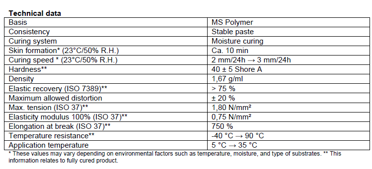 High modulus hybrid polymer sealant and adhesive. Chemically neutral and fully elastic. Outstanding bond strength on nearly all surfaces, even when damp. No bubble formation in high temperatures and humid applications. Good extrudability even at low temperatures. Good colour stability, weather and UV resistance. Free of isocyanates, solvents, halogens and acids. Can be painted over with water based paints. Contains fungicides – suitable for sanitary applications. Virtually odourless.